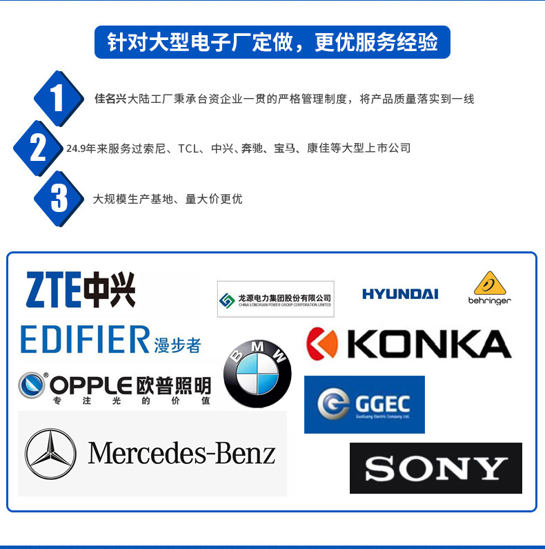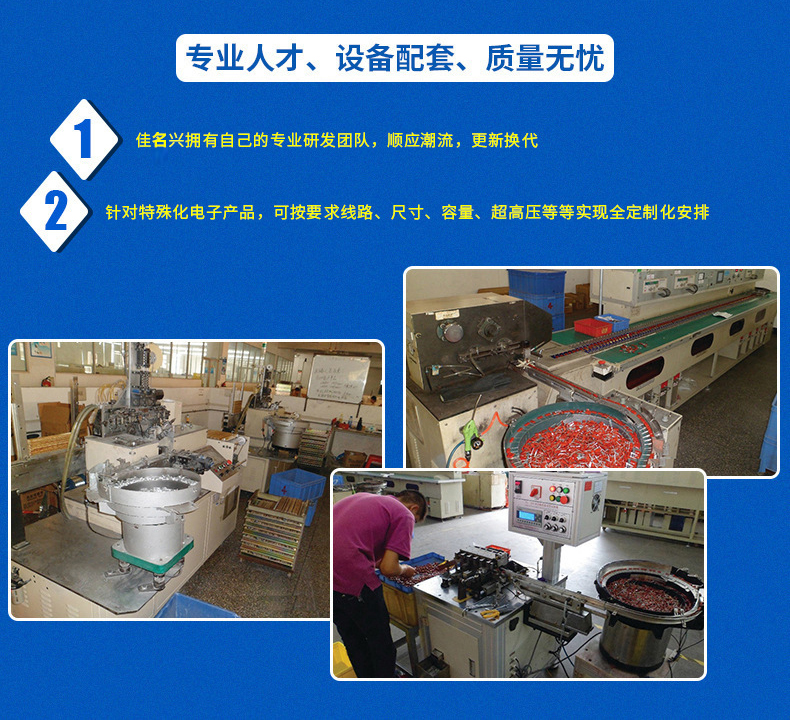 2017年12月28日正式更名為深圳佳名興電容有限公司 佳名興JMX廣東省惠州市電容器工廠占地面積13149平米,廠房面積8227平方米,每年生產(chǎn)的超級(jí)電容(單體、模組、方案定制)薄膜類電容(包括:金屬化薄膜電容、軸向薄膜電容,工業(yè)級(jí)電源用薄膜電容、長(zhǎng)壽命薄膜電容、等)軸向鋁電解電容、電力電容器、雙面金屬化薄膜電容等被動(dòng)元器件達(dá)8-13億只 佳名興JMX電容器60%-70%以上產(chǎn)品出口歐美,印度,東南亞等世界各地,30%-40%銷往中國(guó)大陸,產(chǎn)品規(guī)格齊全,體積小,可靠性優(yōu)良,穩(wěn)定性好,價(jià)格合理 佳名興JMX電容器被廣泛用于:汽車音響,車載分音器,音響分頻器,專業(yè)音響功放,衛(wèi)星通訊設(shè)備,LED驅(qū)動(dòng)電源,LED節(jié)能燈,開(kāi)關(guān)電源及電腦周邊產(chǎn)品等各個(gè)電子行業(yè)