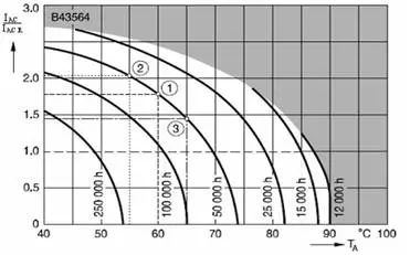 圖2 某鋁電解電容器的壽命與溫度、紋波電流的關(guān)系