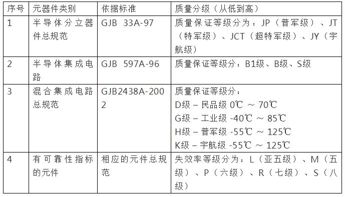 為了保證元器件的質量,我國制定了一系列的元器件標準。在上世紀70年代末期制定了“七專”7905技術協(xié)議和80年代初制定了“七專”8406技術協(xié)議,已具備了軍用器件標準的雛形,但標準是在改革開放之前制定的,有很多局限性,很難與國際接軌。從80年代開始,我國標準化部門參照了美國軍用標準(MIL)體系建立了GJB體系,元器件的標準有規(guī)范、標準、指導性文件等三種形式。
