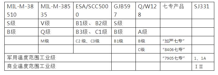 (3)S-1級:完全按照MIL-STD-975(NASA標準的電子電氣和機電源器件目錄)或MIL-STD-1547(航天飛行器和運載火箭用元器件、材料和工藝技術要求)進行采購,并有采購機關的規(guī)范批準。MIL-PRF-38534D混合集成電路規(guī)范(依次低→高等級)