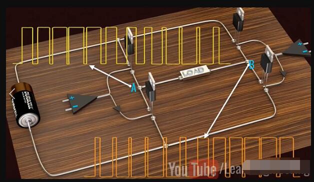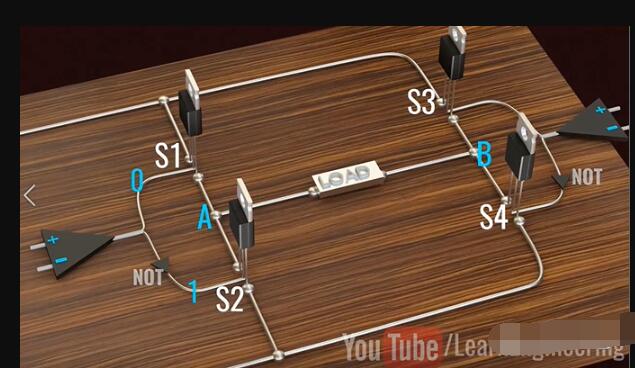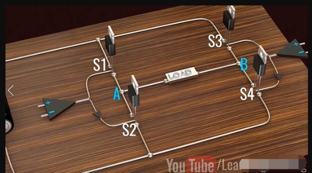 ?? The output is drawn between points and B. To make this circuit analysis easierlet's replace this actual load with a hypothetical load. Just note the current flow when switches S1 and S4 are onand S2 and S3 are off.