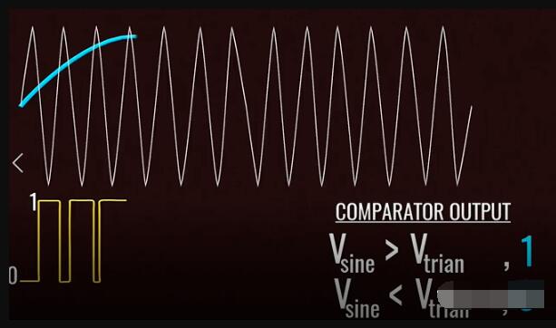 ?? The switching logic of PWM is simple. When the sine way value is more than the triangular wave, comparator produces 1 signal, otherwise zero signal.