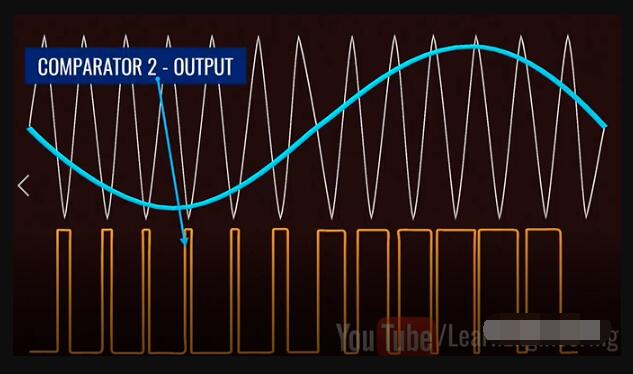 為此使用了兩個(gè)比較器。比較器將正弦波與三角波進(jìn)行比較。一個(gè)比較器使用正常的正弦波;另一個(gè)比較器使用反向正弦波。