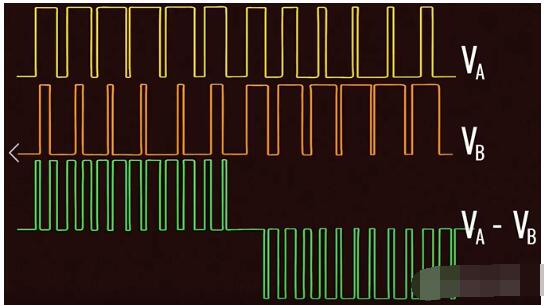 由此,我們可以在點(diǎn)A和點(diǎn)B之間繪制輸出電壓,因此凈電壓將是點(diǎn)A和點(diǎn)B之間的差,這正是我們需要產(chǎn)生正弦波的確切脈沖序列。三角波越精細(xì),脈沖序列將越精確。