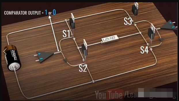 可以看到比較器輸出的一個(gè)分支裝有邏輯非門(mén)。這將確保當(dāng)S1打開(kāi)時(shí)S2將關(guān)閉,這也意味著我們永遠(yuǎn)不能同時(shí)打開(kāi)S1和S2,這將導(dǎo)致DC電路短路。