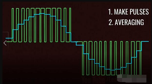 這里面最技巧的一部分是:如果在較短的時(shí)間間隔內(nèi),對(duì)這些脈沖求平均,會(huì)發(fā)生什么?你會(huì)驚訝地發(fā)現(xiàn)平均脈沖的形狀看起來(lái)與正弦曲線(xiàn)非常相似。使用的脈沖越精細(xì)。正弦曲線(xiàn)的就形狀越好。