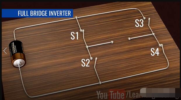 讓我們構(gòu)建一個(gè)有趣的電路,如圖所示,其中包含四個(gè)開(kāi)關(guān)和一個(gè)輸入電壓,該電路稱(chēng)為全橋逆變器。