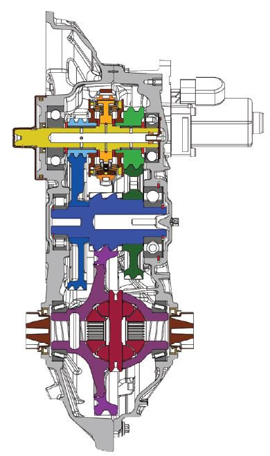 吉凱恩變速器,集成雙離合器式差速器。圖6為其剖視圖。該差速器應(yīng)用在路虎攬勝極光(Range Rover Evoque)、福特福克斯(Ford Focus)RS上 ,也可應(yīng)用在純電動汽車或混合動力汽車上。