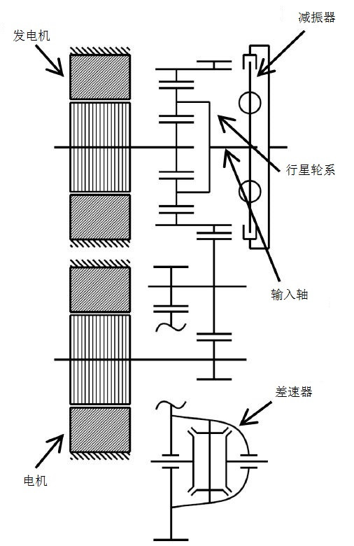 豐田(Toyota)集成發(fā)動機(jī)電動機(jī)發(fā)電機(jī)的變速器,剖視圖如圖9所示,原理圖如圖10所示。應(yīng)用在第四代普銳斯(Prius)等車型上。