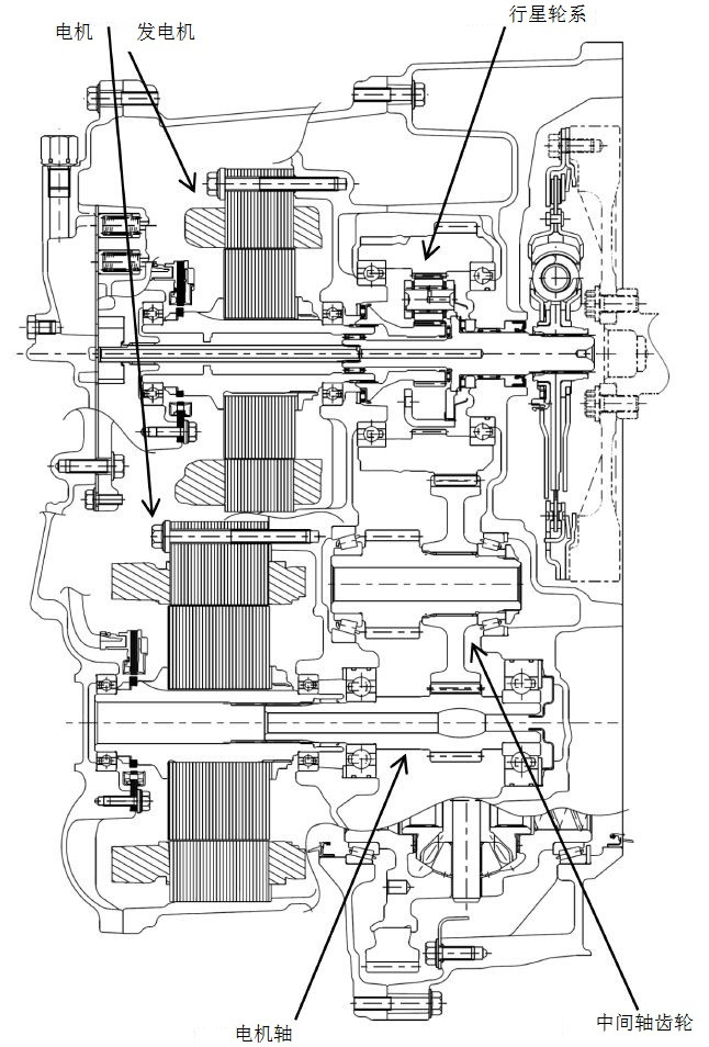 吉凱恩集成發(fā)動機(jī)電動機(jī)發(fā)電機(jī)的變速器,剖視圖如圖7所示。應(yīng)用在三菱歐藍(lán)德(Mitsubishi Outlander)混合動力汽車上。