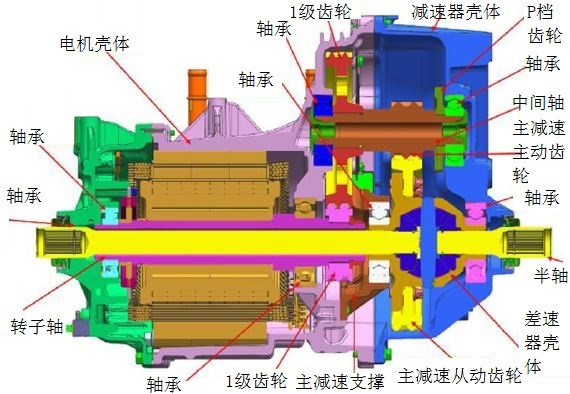 雪佛蘭(Chevrolet)Bolt變速器,輸入軸與輸出軸同軸。圖4為雪佛蘭Bolt同軸單擋變速器剖視圖。應(yīng)用在雪佛蘭Bolt純電動汽車上。