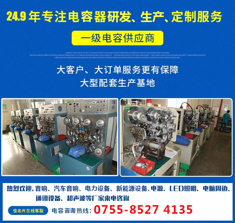 JMX電容為上千家客戶提供電容近20年,JMX電容已成為優(yōu)質(zhì)的電容供應(yīng)商之一,熱誠歡迎各界朋友蒞臨佳名興電容器工廠參觀,指導(dǎo)和業(yè)務(wù)洽談。電容器訂購熱線:+86 13927412413,了解電容器參數(shù):www.experience-days.net |
